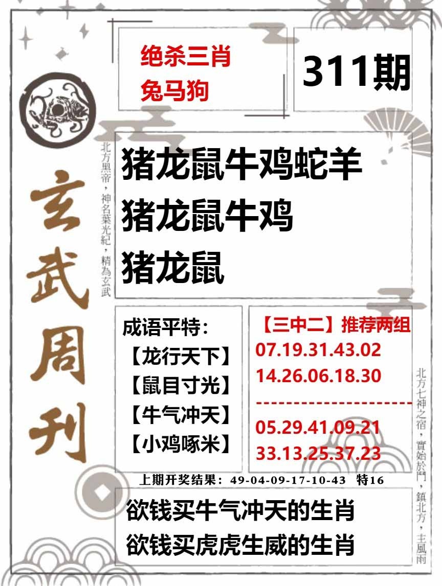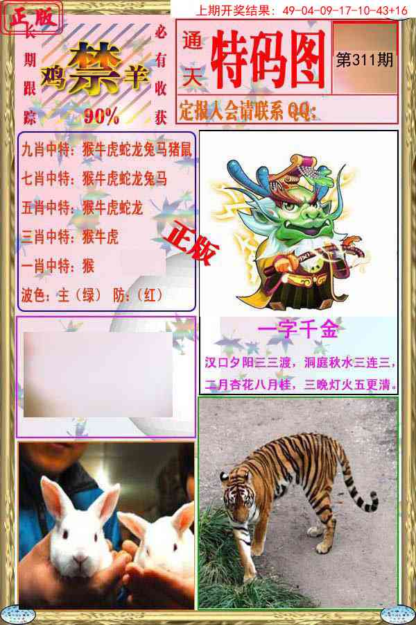 | 300 | 牛肖 | 9尾 | 红双 | 2头 | 开虎40准 |