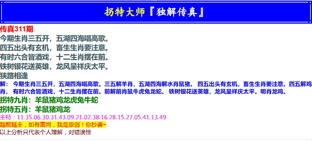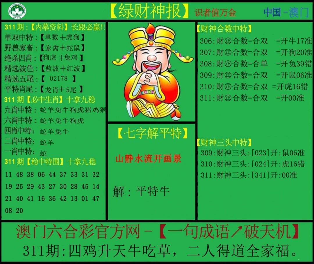 | 311 | 蛇肖 | 7尾 | 蓝单 | 2头 | 开?00准 |